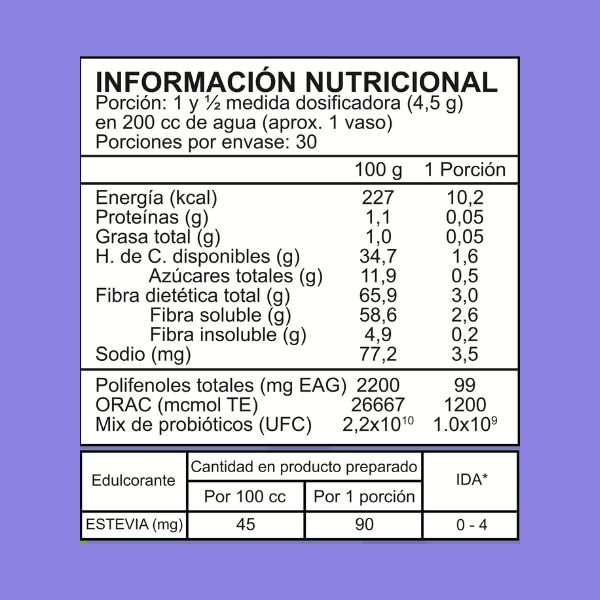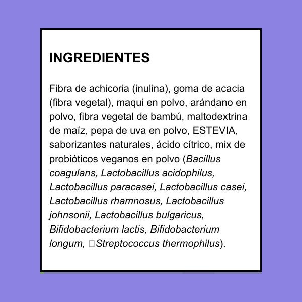 Fibra de achicoria (inulina), goma de acacia (fibra vegetal), maqui en polvo, arándano en polvo, fibra vegetal de bambú, maltodextrina de maíz, pepa de uva en polvo, ESTEVIA, saborizantes naturales, ácido cítrico, mix de probióticos veganos en polvo (Bacillus coagulans, Lactobacillus acidophilus, Lactobacillus paracasei, Lactobacillus casei, Lactobacillus rhamnosus, Lactobacillus johnsonii, Lactobacillus bulgaricus, Bifidobacterium lactis, Bifidobacterium longum, Streptococcus thermophilus).