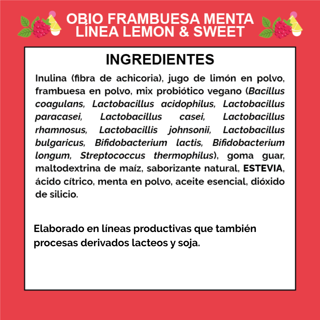 INGREDIENTES: Inulina (fibra de achicoria), jugo de limón en polvo, frambuesa en polvo, mix probiótico vegano (Bacillus coagulans, Lactobacillus acidophilus, Lactobacillus paracasei, Lactobacillus casei, Lactobacillus rhamnosus, Lactobacillis johnsonii, Lactobacillus bulgaricus, Bifidobacterium lactis, Bifidobacterium longum, Streptococcus thermophilus), goma guar, maltodextrina de maíz, saborizante natural, ESTEVIA, ácido cítrico, menta en polvo, aceite esencial, dióxido de silicio.