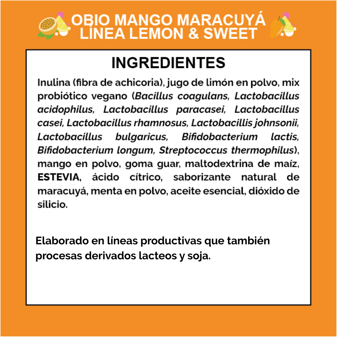 INGREDIENTES: Inulina (fibra de achicoria), jugo de limón en polvo, mix probiótico vegano (Bacillus coagulans, Lactobacillus acidophilus, Lactobacillus paracasei, Lactobacillus casei, Lactobacillus rhamnosus, Lactobacillis johnsonii, Lactobacillus bulgaricus, Bifidobacterium lactis, Bifidobacterium longum, Streptococcus thermophilus), mango en polvo, goma guar, maltodextrina de maíz, ESTEVIA, ácido cítrico, saborizante natural de maracuyá, menta en polvo, aceite esencial, dióxido de silicio.