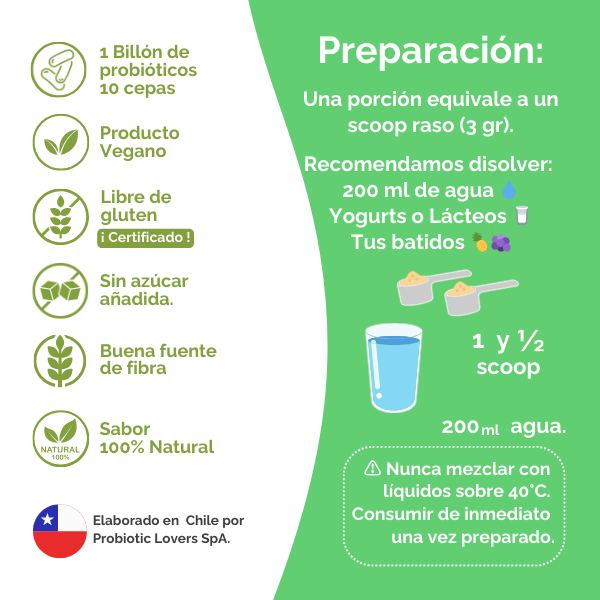 - Disuelve bien 1 y 1/2 scoop raso (5,5 g) en 200 cc de agua fría y disfruta inmediatamente.